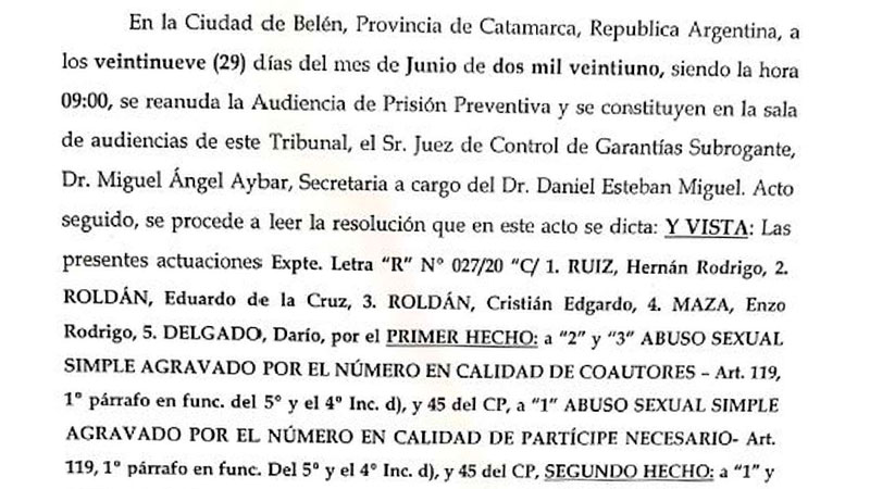 Miguel Ángel Aybar, magistrado en lo civil y comercial del departamento Belén, hizo lugar al pedido de la defensa de Rodrigo Hernán Ruiz; el policía Edgardo de la Cruz Roldán; y su hijo, Cristian Roldán, y los dejó en libertad bajo caución de 100 mil pesos. Los tres están acusados de atacar sexualmente a Paula -de 43 años y que dicta clases de música- en la madrugada del 18 de octubre de 2020.