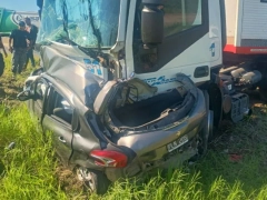 Un hombre y una mujer perdieron la vida en el acto: primero chocaron contra un muro en la inconclusa autovía de la Ruta Nacional 12 en Corrientes; el rodado quedó atravesado justo al paso de un transporte de encomiendas.