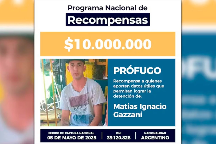 El Ministerio de Seguridad de la Nación ofreció una recompensa de 10 millones de pesos para quienes puedan aportar información que permita localizar a Matías Ignacio Gazzani, un delincuente rosarino de alto perfil vinculado al narcotráfico y prófugo desde febrero de 2024.