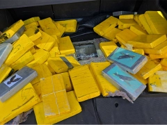 Al inspeccionar el rodado y levantar la alfombra que cubría el piso del baúl, los gendarmes detectaron un doble fondo y extrajeron del mismo 79 paquetes rectangulares (envueltos en cinta amarilla y gris) que contenían una sustancia blancuzca.