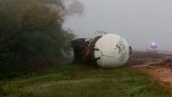 En ese lugar y mientras una espesa niebla reduce la visibilidad casi totalmente en el trazado vial, un camión cisterna que transportaba gas butano, se despistó y volcó en la banquina.