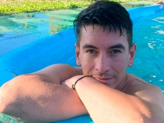 El joven es de complexión ancha, delgado y mide 1.76. Tiene el pelo castaño oscuro, corto a los lados, sus ojos son verdes y es de tez blanca.