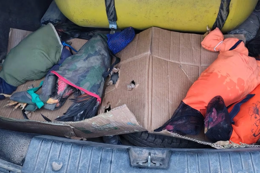 Al revisar el baúl, encontraron ocho gallos de riña inmovilizados y envueltos en fundas de tela, junto con siete picos metálicos, tijeras y cintas adhesivas, elementos utilizados en este tipo de prácticas ilegales.