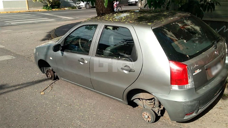 Durante la madrugada de este jueves, delincuentes le robaron las cuatro ruedas a un Fiat Palio que estaba estacionado en Ituzaingó y Marcial Candioti, pleno barrio Candioti, una de las zonas más caras para vivir en la capital de la provincia de Santa Fe.