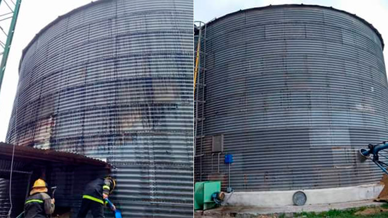 Nogueira confirmó que el fuego se controló alrededor de las 13. "Se vació desde adentro, se realizaron aberturas al costado de los silos por las cuales se sacó el material. Luego una pala mecánica cargó la soja quemada y la trasladó hacia otro lugar".