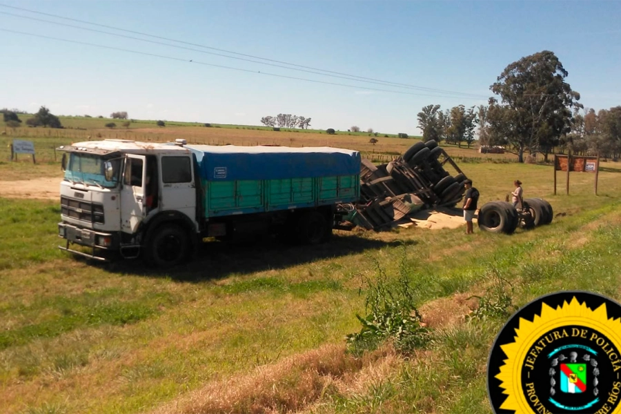 De acuerdo a lo informado por el conductor, otro vehículo que circulaba de frente en maniobra de sobrepaso lo obligó a correrse hacia la banquina. Esa maniobra derivó en la pérdida de estabilidad y el vuelco del acoplado cargado.