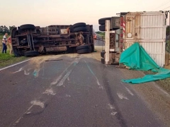 El rodado circulaba en sentido de sur a norte, cuando a poca distancia de retomar el tramo de autovía, tuvo el percance que lo dejó volcado sobre su lateral derecho, lo que motivó que desparramara gran parte de la carga de granos que transportaba.