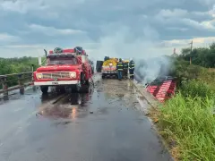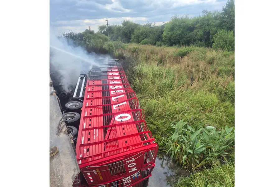 Por causas que se tratan de establecer, el camión jaula se despistó a la altura de una curva y cayó al vacío. Como consecuencia del impacto, la cabina del rodado se incendió y el conductor del rodado falleció en el lugar.