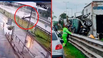 En un principio el vehículo golpeó contra el guardarrail pero se vio en el video que ya había dado un trompo previo. Luego, al chocar con esa protección, en vez de quedar dentro de la calzada, voló por los aires hasta impactar con la cabina de peaje en la que terminó destrozado y de forma lateral entre la construcción y el alambre que delimita la zona.