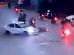 Los videos muestran el momento en que la primera motocicleta impacta contra el automóvil, seguido por el choque de una segunda moto, antes de que el coche termine de costado y colisione contra varias motos más.
