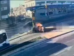 Producto del choque, el vehículo particular terminó contra un poste de semáforo y comenzó a incendiarse a los pocos segundos. Las cámaras de seguridad de la zona registraron el momento en que el conductor logró salir del habitáculo con parte de su ropa prendida fuego, mientras intentaba sofocar las llamas.