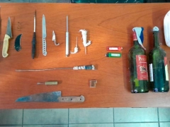 Tras el operativo policial desarrollado en la madrugada de este sábado, se registraron detenciones y se logró el secuestro de armas de fabricación casera, como facas o chuzas; también incautaron botellas con material combustible y sopapas, utilizadas para fabricar “bombas molotov”.
