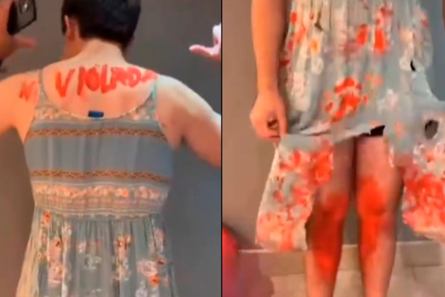 Las imágenes, muestran al joven con un vestido roto, manchas rojas que simulaban sangre en el cuerpo y la palabra “violada” escrita en la espalda, una representación que desató el repudio generalizado por su contenido ofensivo y violento.