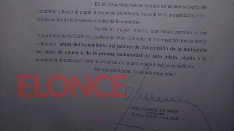 El letrado espera que la novedad también sea dada conocer a los integrantes de la Corte de Justicia del Senado, antes del tratamiento del pedido de suspensión de la audiencia de causa y de la prueba testimonial de este juicio, atento a la incidencia directa que tiene la renuncia en la continuidad del juicio político.