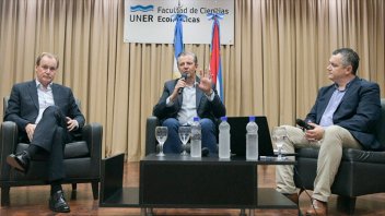 Bahl, Bordet y Monjo asistieron este miércoles a la Facultad de Ciencias Económicas de la Universidad Nacional de Entre Ríos. Fueron recibidos por el decano Sebastián Pérez, quien moderó el encuentro.