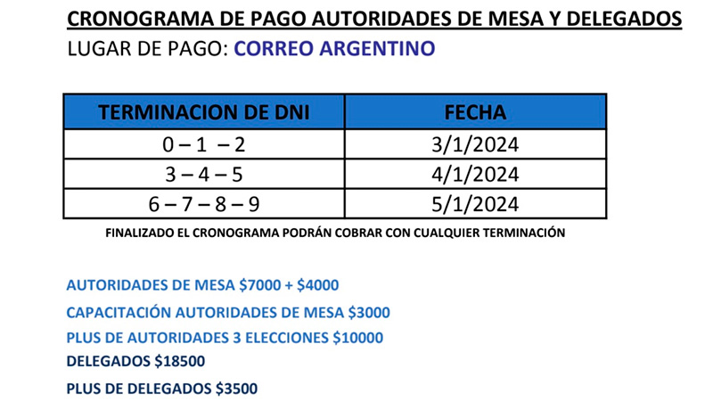 El próximo miércoles se inicia el pago de la suma correspondiente a las personas que se desempeñaron como autoridades de mesa en el balotaje presidencial, elección desarrollada el pasado 19 de noviembre. Será por finalización de DNI y culminará el viernes venidero.