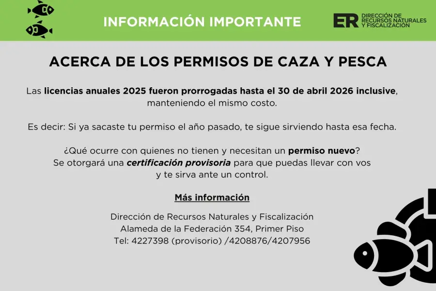 En este sentido, se recuerda que las licencias anuales 2025 fueron prorrogadas según Resolución 0083/26 DRNF hasta el 30 de abril inclusive. Por lo tanto, quienes ya cuenten con su permiso vigente podrán continuar utilizándolo hasta esa fecha sin necesidad de realizar un nuevo trámite.