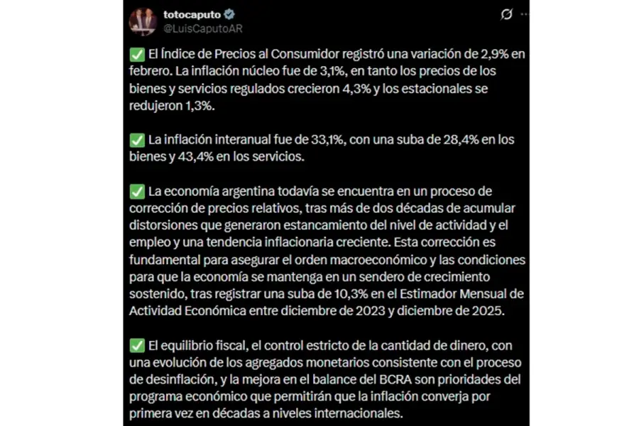 El INDEC dio a conocer la cifra de inflación de febrero y, casi en paralelo, el ministro de Economía, Luis “Toto” Caputo, salió a explicar por qué “la economía argentina todavía se encuentra en un proceso de corrección de precios”.