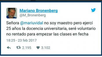 <blockquote class="twitter-tweet" data-lang="es"><p lang="es" dir="ltr">Señora <a href="https://twitter.com/mariuvidal">@mariuvidal</a> no soy maestro pero ejercí 25 años la docencia universitaria, seré voluntario no rentado para empezar las clases en fecha</p>— Mariano Bronenberg (@M_Bronenberg) <a href="https://twitter.com/M_Bronenberg/status/834876894227095553">23 de febrero de 2017</a></blockquote>