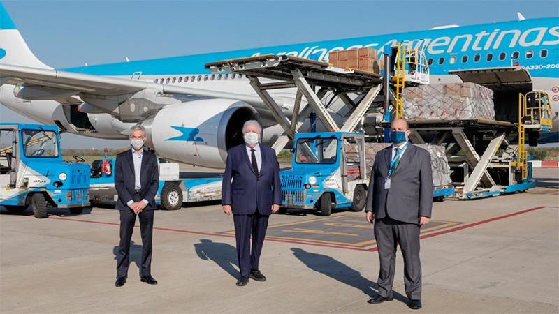 En el aeropuerto de Ezeiza, supervisaron la descarga del material los ministros de Salud Ginés González García y de Transporte, Mario Meoni junto al titular de la empresa estatal Aerolíneas Argentinas, Pablo Ceriani. Los tres funcionarios darán una conferencia de prensa en la misma estación aérea.