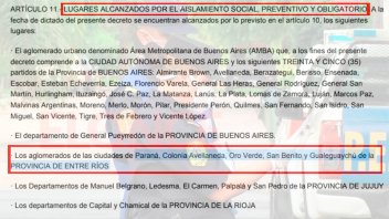 El Gobierno nacional estableció que Paraná, Colonia Avellaneda, Oro Verde, San Benito y Gualeguaychú se encuentran bajo aislamiento social y obligatorio. El gobernador está autorizado a disponer excepciones. <i>Qué dice el decreto</i>.