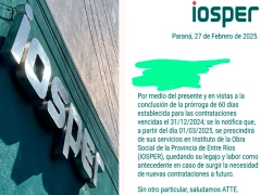 “Por medio del presente y en vistas a la conclusión de la prórroga de 60 días establecida para las contrataciones vencidas el 31/12/2024; se lo notifica que, a partir del día 01/03/2025, se prescindirá de sus servicios en Instituto de la Obra Social de la Provincia de Entre Ríos (IOSPER), quedando su legajo y labor como antecedente en caso de surgir la necesidad de nuevas contrataciones a futuro”.
