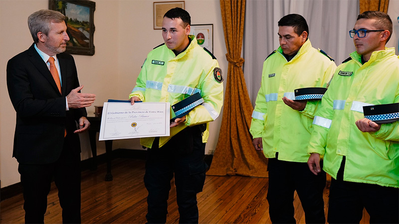 El titular del Poder Ejecutivo provincial felicitó por su accionar al oficial subinspector Pedro Bauer y a los cabos primero Enzo Romero y Diego Serrano -integrantes de la Dirección de Prevención y Seguridad Vial de Policía de Entre Ríos-, quienes el miércoles 12 del corriente secuestraron 300 panes de gelamón en el puesto caminero ubicado en el kilómetro 496 de la ruta nacional Nº 12, a la altura de la localidad de Aldea Santa María. El explosivo plástico estaba dividido en cajas que eran transportadas en una camioneta sin medidas de seguridad.