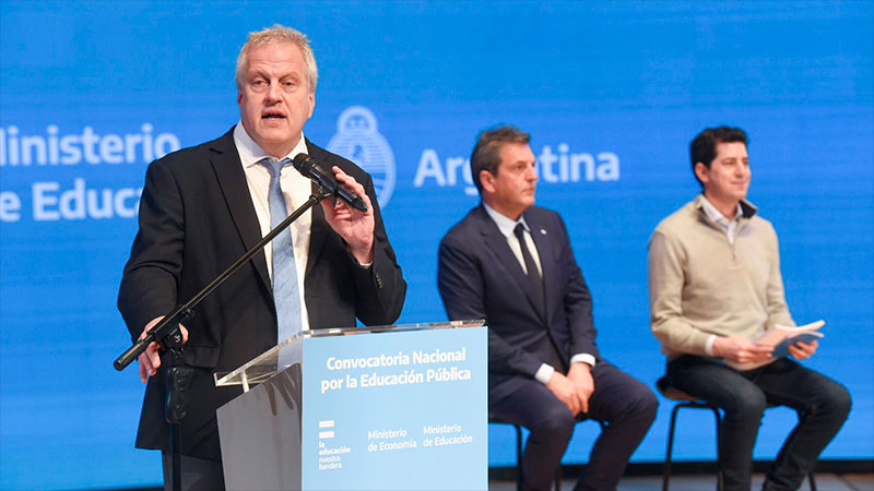 El aumento de la inversión educativa al 8% del PBI, el sostenimiento de la distribución de libros de texto "uno a uno" para todos los estudiantes, la ampliación de la cobertura del nivel inicial o la entrega de equipamiento tecnológico son algunos de los puntos destacados incluidos en el proyecto de Ley de Financiamiento Educativo presentado hoy por el ministro de Economía y candidato a presidente de Unión por la Patria (UxP), Sergio Massa y sus pares de Educación, Jaime Perczyk, e Interior, Eduardo de Pedro.