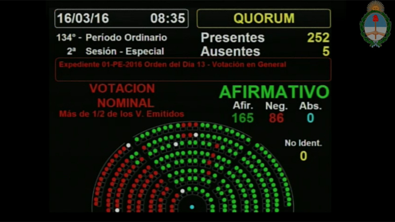 A las 8:35 de la mañana, el proyecto de ley enviado por el gobierno de Mauricio Macri obtuvo la media sanción por 165 votos afirmativos contra 86 en contra, y tras el tratamiento en particular será girado al Senado.