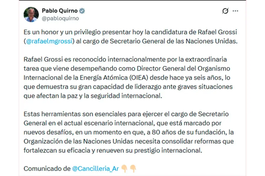 “Es un honor y un privilegio presentar hoy la candidatura de Rafael Grossi al cargo de Secretario General de las Naciones Unidas”, escribió el ministro de Relaciones Exteriores y Culto en su cuenta de la red social X.