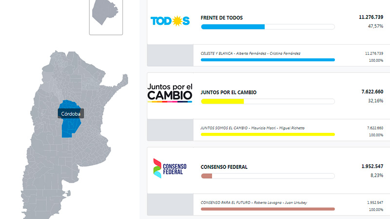 Alberto Fernández - Cristina Fernández logró el 43,63% de los votos, contra el 33,88% de Mauricio Macri y Miguel Pichetto en Santa Fe. En Córdoba el resultado fue inverso y el binomio oficialista consiguió una victoria por 18 puntos.