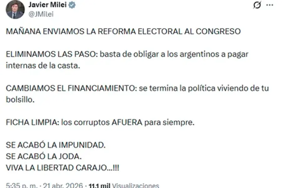 En su mensaje, el mandatario sostuvo que el objetivo es “terminar con la impunidad” y cuestionó el esquema actual de primarias al afirmar que “basta de obligar a los argentinos a pagar internas de la casta”. La propuesta también busca limitar el uso de recursos públicos en la política y avanzar hacia un modelo que, según el oficialismo, reduzca privilegios.