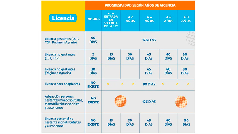 Para personas no gestantes, la licencia va creciendo progresivamente de 15 días a 90 en 8 años. Para las personas que sí lleven adelante un embarazo, la licencia se extiende a 126 días desde el día que se aprueba el proyecto (un aumento desde los 90 días actuales). Para adoptantes se reconocen 90 días de licencia desde el momento en el que se apruebe el proyecto.