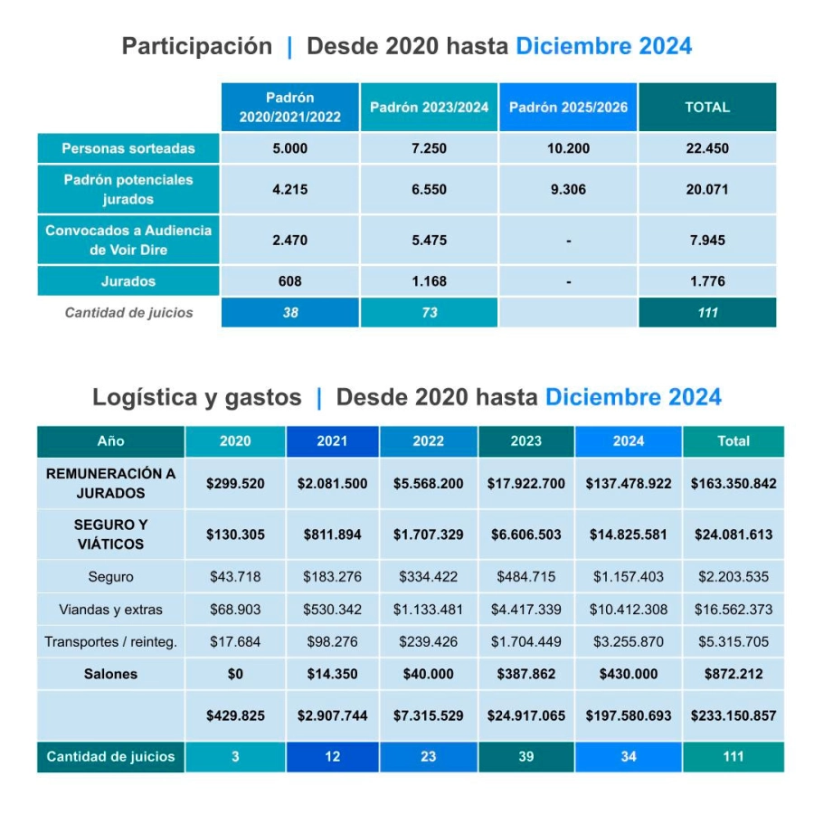 En 2024, en igualdad de género, 544 personas se desempeñaron como jurados, y desde la implementación del sistema popular fueron convocados a la audiencia de selección de jurados 7.945 potenciales jurados, de las cuales 1.776 personas ejercieron ese rol en los 111 juicios realizados.