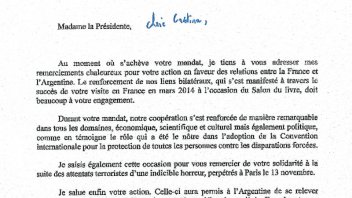 En el escrito, Francois Hollande agradeció la solidaridad que la mandataria argentina tuvo tras los atentados en París y le deseó "pleno éxito en sus futuras actividades".