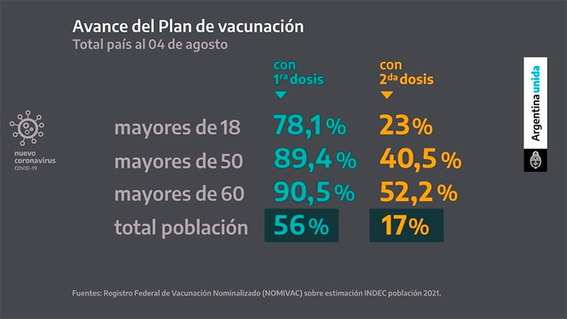 En ese contexto, afirmó que el objetivo para este mes "es aumentar el porcentaje de segundas dosis, priorizando a las personas mayores de 50 años, en especial quienes tienen más tiempo desde la primera dosis. En agosto vamos a aplicar más de 7 millones de segundas dosis. Además, seguiremos aplicando las primeras dosis a los y las adolescentes entre 12 y 17 años que hayan sido priorizados".