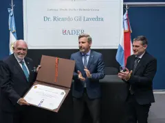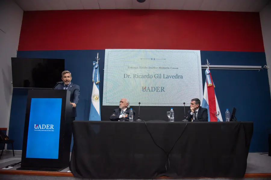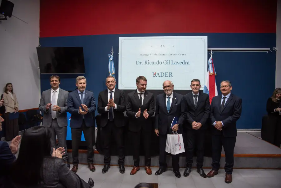 Durante la ceremonia, realizada en la sede del Rectorado de Uader, el mandatario estuvo acompañado por el rector de la institución, Luciano Filipuzzi, y la vicegobernadora Alicia Aluani. En ese marco, destacó la figura de Gil Lavedra como "un protagonista de nuestra historia, no solo por haber integrado el tribunal que juzgó los crímenes de lesa humanidad, sino también por su defensa irrestricta de la democracia y la institucionalidad".