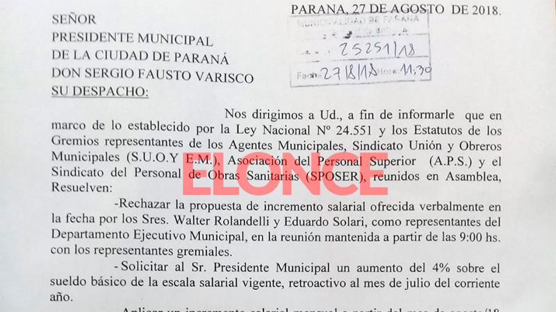 En una declaración conjunta, el Suoyem, la Asociación del Personal Superior y Sindicato de Obras Sanitarias, rechazaron la oferta salarial realizada este lunes por el gobierno municipal, del seis por ciento a partir de septiembre.