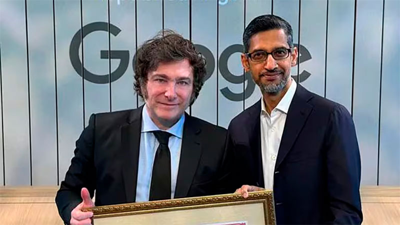 Después de su disertación en Stanford, el presidente se encontró con Sundar Pichai, CEO de Google. La reunión sucedió en las oficinas centrales de Google en Mountain Blue -California-, y Milei aprovechó la oportunidad para ofrecer describir a la Argentina como un escenario posible para desplegar un polo de innovación tecnológica.