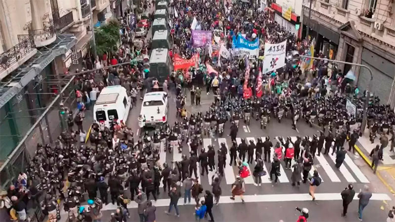 “Acá hay organizaciones sindicales, estudiantiles, jubilados, jubiladas, estudiantes, feministas. Nos encontramos con esta provocación que son cordones tras cordones y gas pimienta por todos lados. Me vienen empujando hace cinco cuadras, estábamos parados manifestándonos. Fue un cordón atrás de otro que nos empezó a cerrar y tirar gases”, explicó.