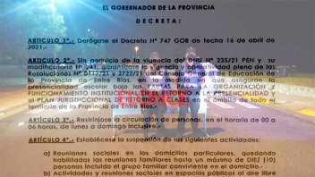 Tras el mensaje del Gobernador, esta tarde se dio a conocer el texto del decreto rubricado por Gustavo Bordet este viernes y que entrará en vigencia a partir de las 00 de este sábado.