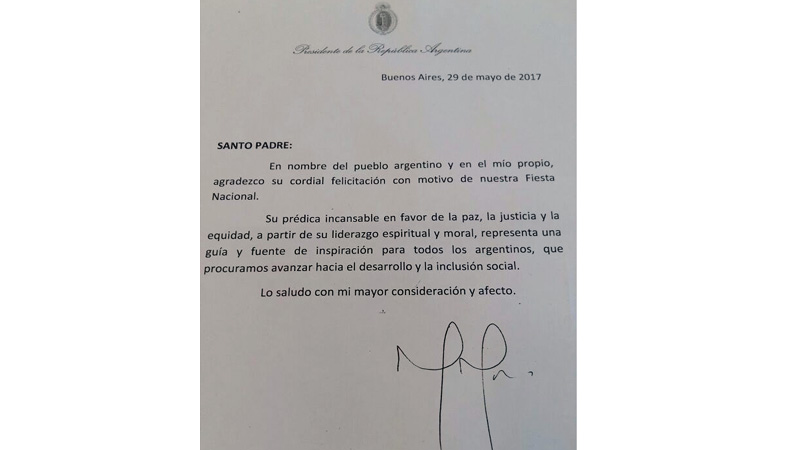 Macri se pronunció en esos términos en una carta que remitió al Vaticano en respuesta al mensaje enviado por Su Santidad la semana pasada en vísperas de la celebración patria.