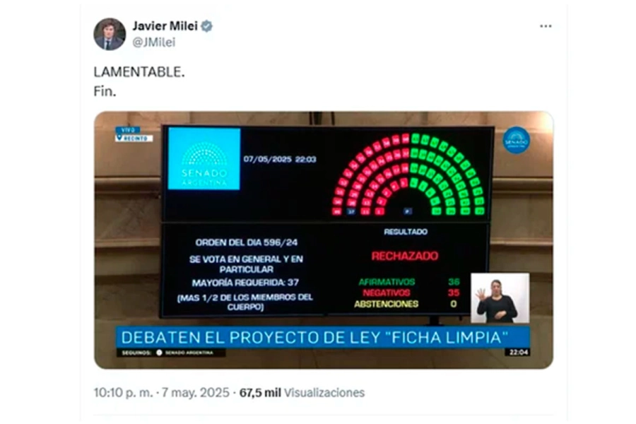 El presidente Javier Milei calificó como “lamentable” el rechazo del proyecto de Ficha Limpia en el Senado, iniciativa que buscaba impedir que personas condenadas en segunda instancia por corrupción o delitos graves pudieran ser candidatas a cargos nacionales.