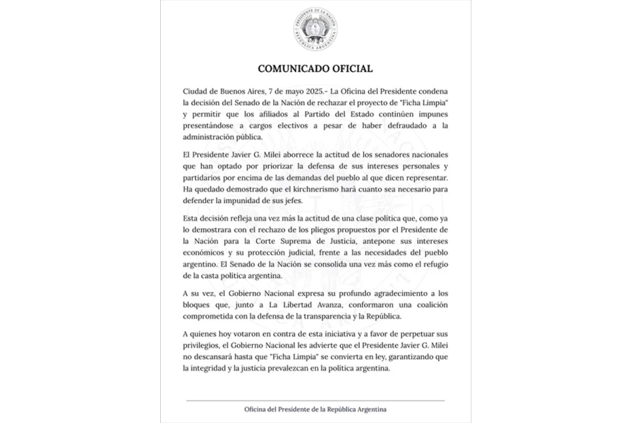 Finalmente, el Gobierno advirtió a quienes votaron contra la iniciativa: “El Presidente Javier G. Milei no descansará hasta que ‘Ficha Limpia’ se convierta en ley, garantizando que la integridad y la justicia prevalezcan en la política argentina”.