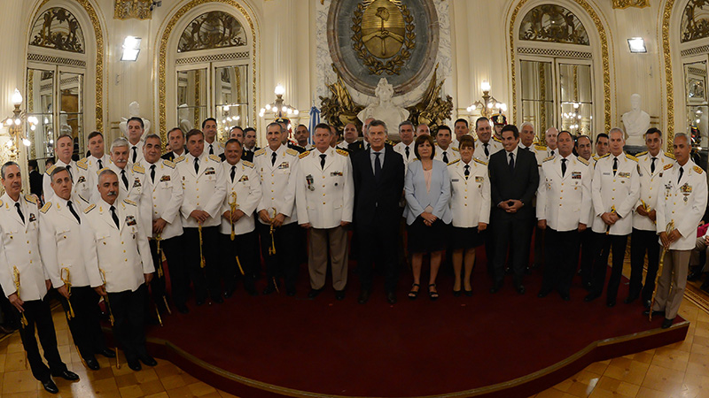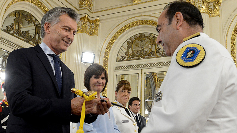 El presidente Mauricio Macri encabezó en la Casa de Gobierno el acto de entrega de sables a los oficiales recién ascendidos a los máximos grados de la Policía Federal, Prefectura Naval, Gendarmería y Policía de Seguridad Aeroportuaria.