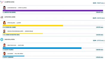 De acuerdo a los datos oficiales, con el 96,73% de las mesas escrutadas, Milei sacó el 30,08% (7.077.523 votos), mientras que con la sumatoria de sus dos candidatos Juntos por el Cambio obtuvo el 28,28% (6.654.288 votos), y Unión por la Patria llegaba al 27,22% (6.404.376 votos).
