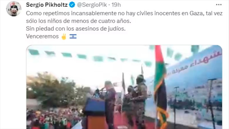 El posteo de Pikholtz muestra a miembros de Hamas fuertemente armados en medio de diferentes situaciones. El también presidente de la Organización Sionista Argentina lo replicó en X junto con la siguiente frase: “Como repetimos incansablemente no hay civiles inocentes en Gaza, tal vez solo los niños de menos de cuatro años. Sin piedad con los asesinos de judíos. Venceremos”.