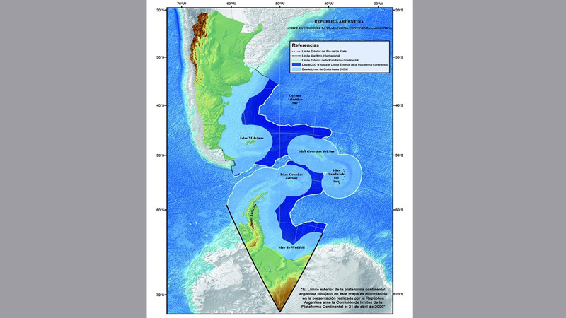 La presentación argentina fue realizada en 2009, e incluyó el reconocimiento del límite exterior de la plataforma continental de todo el territorio argentino: continental, Islas Malvinas, Georgias del Sur y Sandwich del Sur y Antártida Argentina, por lo que el dictamen de la ONU ratifica los límites argentinos y la soberanía nacional sobre el Atlántico Sur.