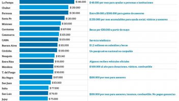 En Río Negro cobran 80 mil pesos de bolsillo y 7000 más si deben alquilar una propiedad en Viedma (sin contar 100 mil pesos mensuales para asesores). Los sanjuaninos cobran 46.500 pesos en blanco y otro 50% en gastos de representación.