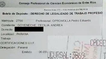 La certificación de ingresos fue validada por el Consejo Profesional de Ciencias Económicas de Entre Ríos dos días después de que fuera solicitada, es decir el 7 de septiembre de 2018 a través de la legalización 1-03773-18.